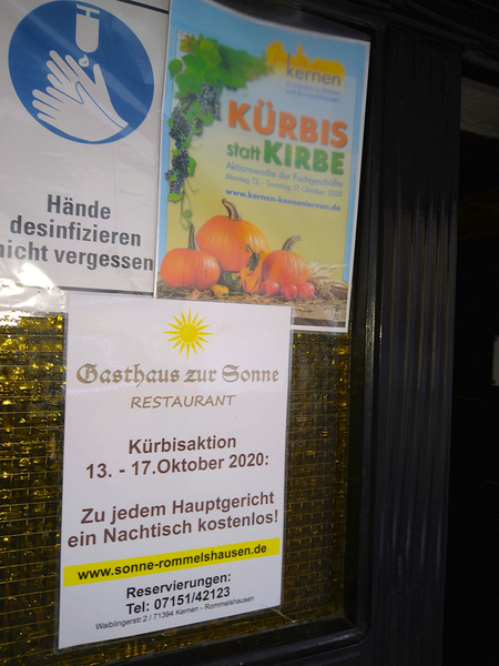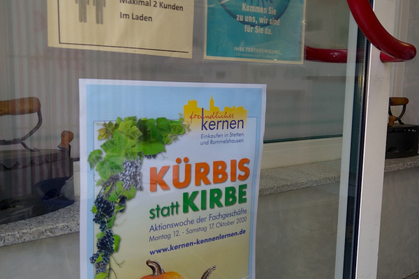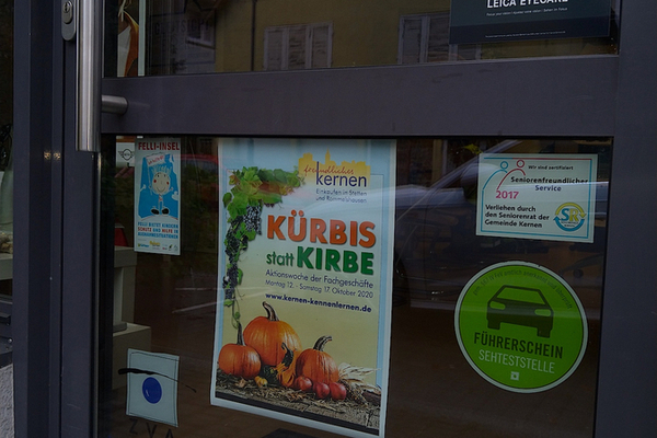 Der Marketingverein Freundliches Kernen hat sich mal wieder etwas Besonderes einfallen lassen und wollte es wie auch ein paar andere nicht einfach so hinnehmen, dass nach der Absage der Römer-Kirbe-Veranstaltungen so gar nichts stattfinden sollte. Daher wurde in enger Zusammenarbeit mit dem Kümmerer und weiteren Aktiven die Aktion Kürbis statt Kirbe kreiert. In der KW 42 konnten Kunden/Innen und Bürger/Innen in bis zu 30 Fachgeschäften/Betrieben in Kernen im Remstal attraktive Angebote erhalten. Die teilnehmenden Betriebe waren mit einem Aktions-Plakat und vor allem kreativen Kürbis-Dekorationen gut zu erkennen. Sie finden hier unten Impressionen von den Schaufenstern und Ladengeschäften.