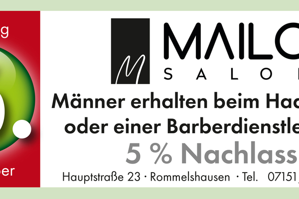 Lassen Sie sich verwöhnen und für die Feiertage noch schöner stylen. Das Team vom Mailo Salon in Kernen-Rommelshausen freut sich auf Sie. Das Angebot finden Sie hier unten; zweites Motiv.