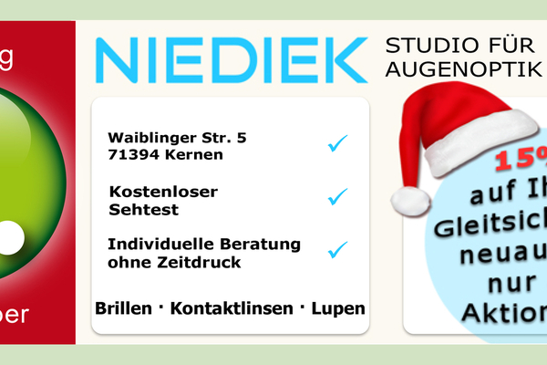 Nutzen Sie dieses attraktive Angebot von Niediek - Studio für Augenoptik. am heutigen Tag. Siehe hier unten; zweites Motiv.